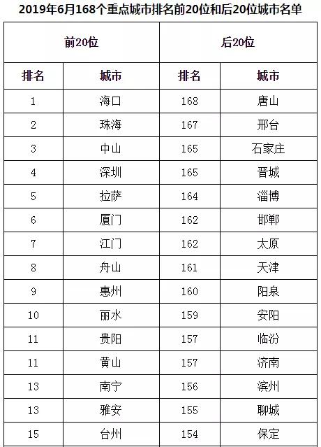 2019年6月,168個重點(diǎn)城市中唐山、邢臺、石家莊市等20個城市空氣質(zhì)量相對較差(從第168名到第149名);??凇⒅楹?、中山市等20個城市空氣質(zhì)量相對較好(從第1名到第20名,見附表1)。